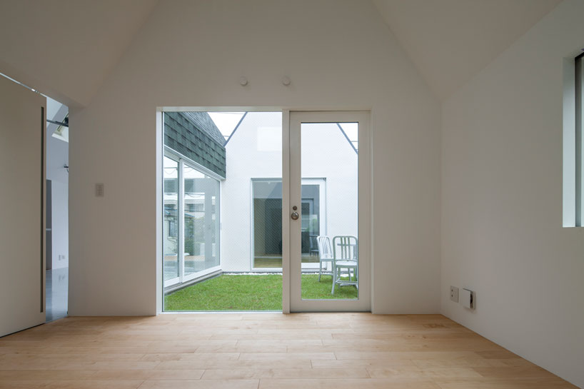 在建筑后部,坡屋頂體量長度不一,結合隨機布置的窗洞,可以獲得不同角度的照明。從外部看,建筑的每個面都覆蓋著綠色的屋面瓦,同時左側立面都是白色的。這棟與眾不同的住宅在頂層有一處室外庭院,與周圍更加傳統的住宅相比,它從結構上和形象上都要顯得有趣。