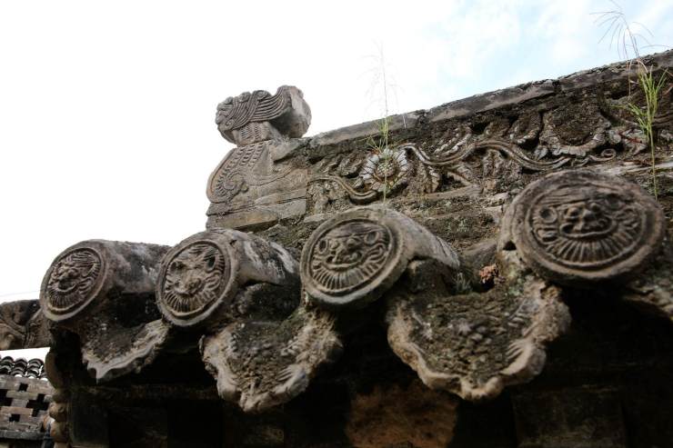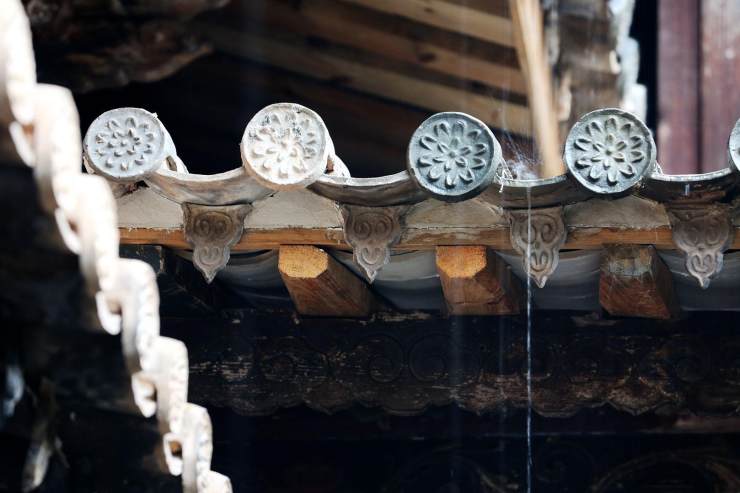 聰慧的中國工匠們利用樸實(shí)小瓦做出各種瓦花墻。杭州城永福寺的瓦花墻內(nèi)墻外風(fēng)光旖旎。晉中票號的東家們使用瓦花防盜,精湛技藝的匠人疊小瓦層層相扣成銅錢形,日常是票號的裝飾,任風(fēng)吹雨打,瓦自巋然不動(dòng)。若是蟊賊攀爬,在不均勻受力作用下,瞬間分化瓦解。紅河建水的黃氏宗祠小青瓦對花成屋脊,別樣姿容。