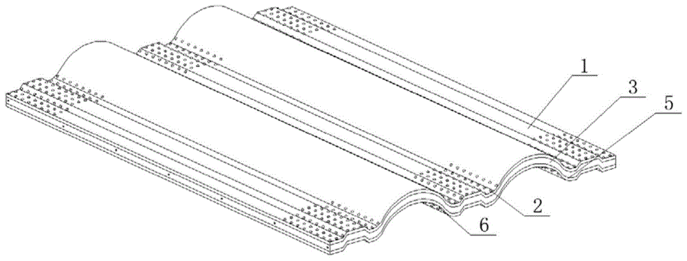 圖中:1、頂層樹脂瓦;2、頂部防滑凸點;3、隔熱層;4、支撐架;5、底層樹脂瓦;6、底部防滑凸點。