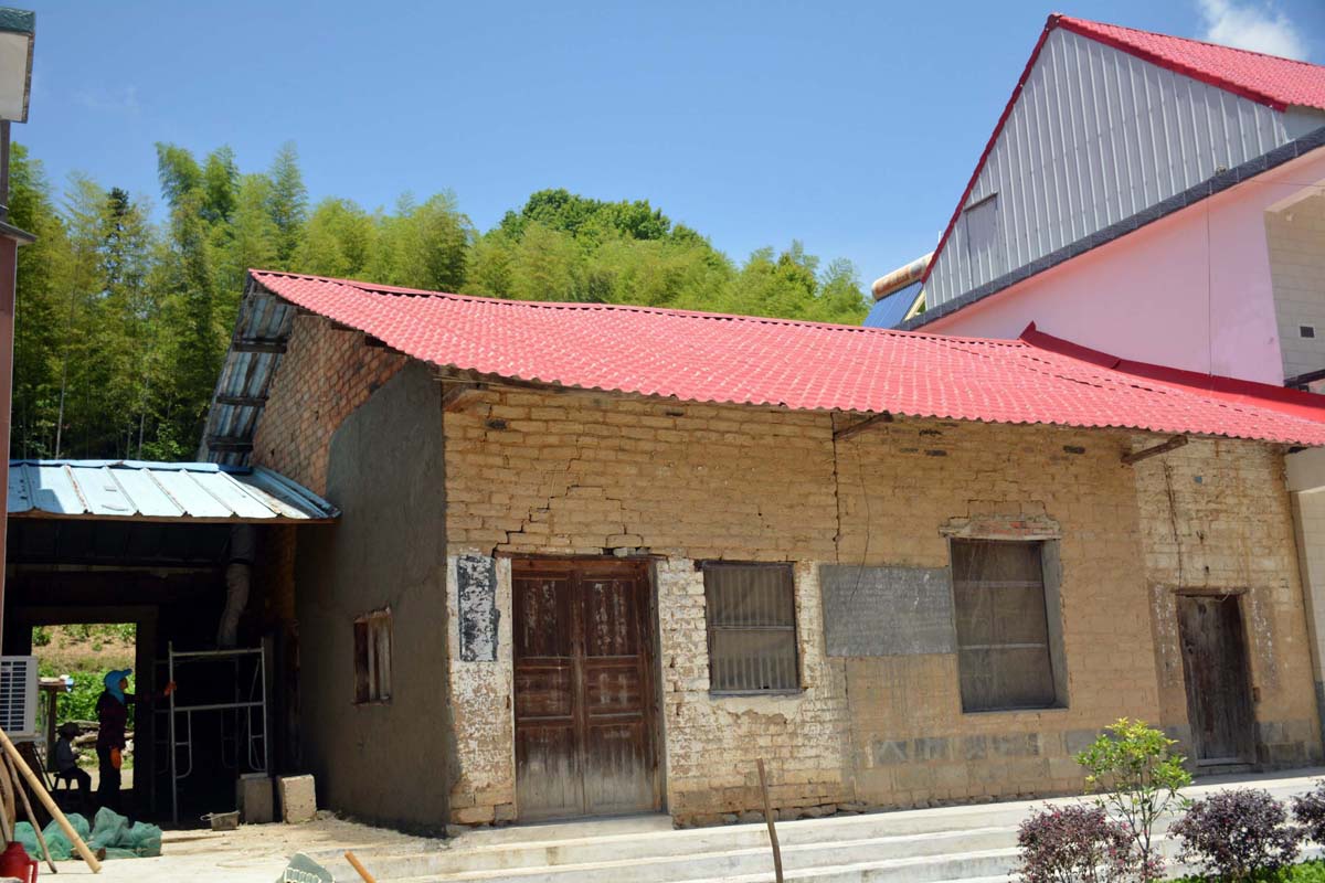 圖為工人在用粉刷墻壁。老屋是用土磚砌起來的,以前,屋頂上蓋的是泥巴瓦,現在,房子的主人將其換成了紅色樹脂瓦。村民說,要像儲大叔保護上馬石一樣保護老房子,說不定將來這樣的房子成為村里的一道景點。