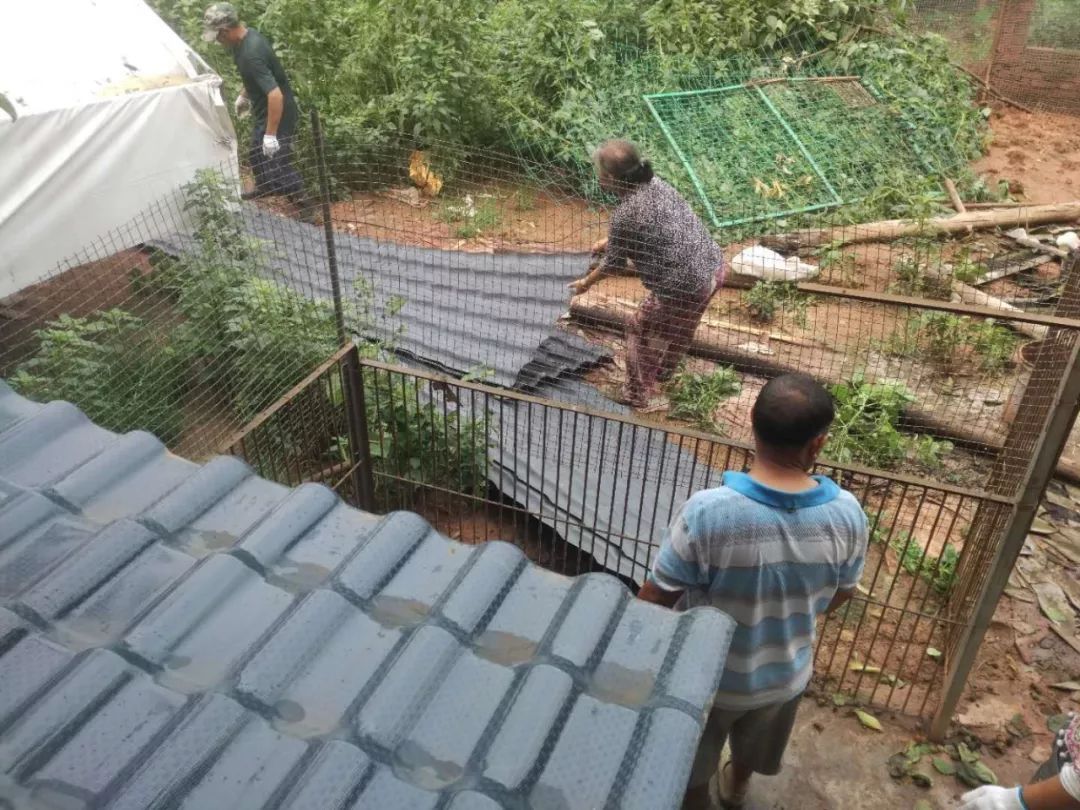 為了防止狗狗們跑掉,愛之家的所有工人們都冒雨出動(dòng),將后山圍了一圈鋼網(wǎng)。這些工人的年紀(jì)都在65歲以上,但他們干起活來(lái),卻是一點(diǎn)也不含糊。鋼網(wǎng)并不是長(zhǎng)久之計(jì),圍墻還得再修,一切只能等到雨停了。