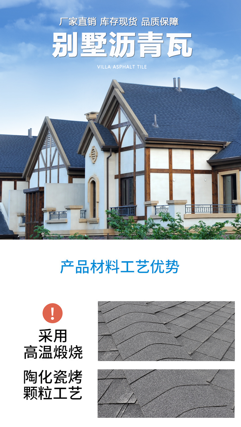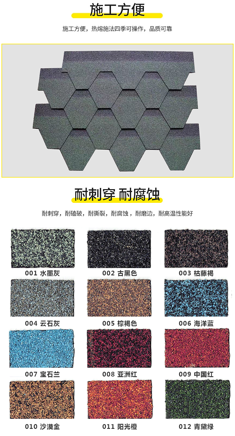 瀝青瓦優點方面:**,造型多樣,適用范圍廣。第二,隔熱、保一第三,屋頂承重輕,安全可靠。第四,施工簡便,綜合成本低。第五,經久耐用,無破碎之憂。第六,色彩豐富,美觀環保,第七,防水,耐腐蝕,第八,抗風,防塵時尚。