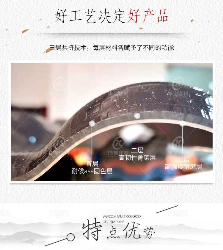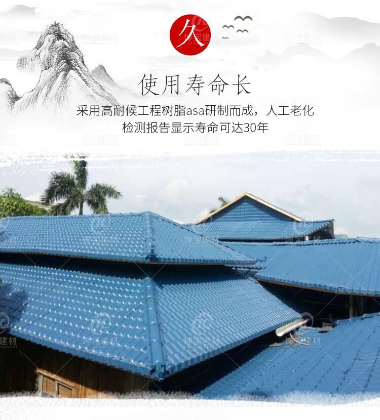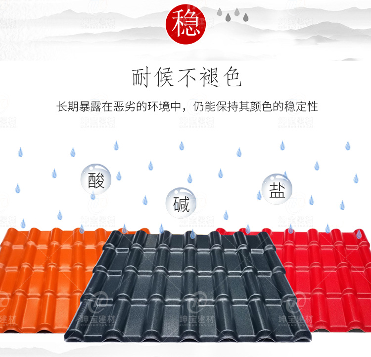 《坤寶牌》合成樹脂屋面瓦,原料采用高耐候性ASA樹脂研制,中間是發(fā)泡隔熱骨架層,底層為高強(qiáng)度耐磨層。防腐耐候性能**,承載力好,能夠抵擋酸堿鹽侵蝕,化工廠房及污染惡劣環(huán)境都適用。由于合成樹脂屋面瓦屬于高分子聚合物,本身瓦面就致密不吸水,大大提升防水效果,而且具有荷葉效應(yīng),灰塵雜物等不容易堆積在屋面上,減輕了瓦面的負(fù)擔(dān)及房梁的承重,還可延長(zhǎng)了合成樹脂屋面瓦的使用壽命。